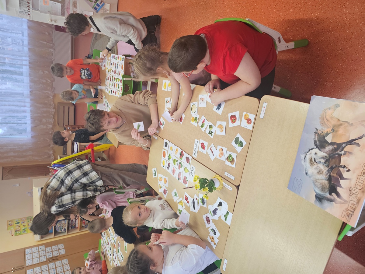 Nodarbībā bērni iepazina sezonalitātes kalendāru, uzzināja, kuri labumi aug Latvijā dažādos gadalaikos, un ar prieku darbojās praktiskās aktivitātēs.