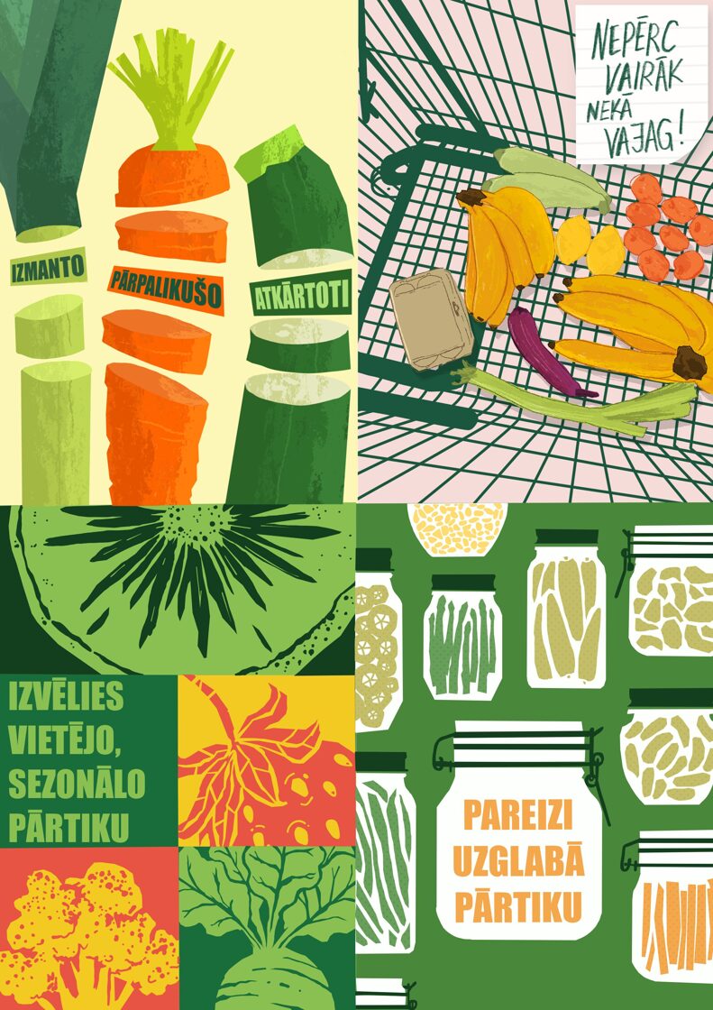 Informējoši plakāti par atbildīgu pārtikas patēriņu, atkritumu šķirošanu