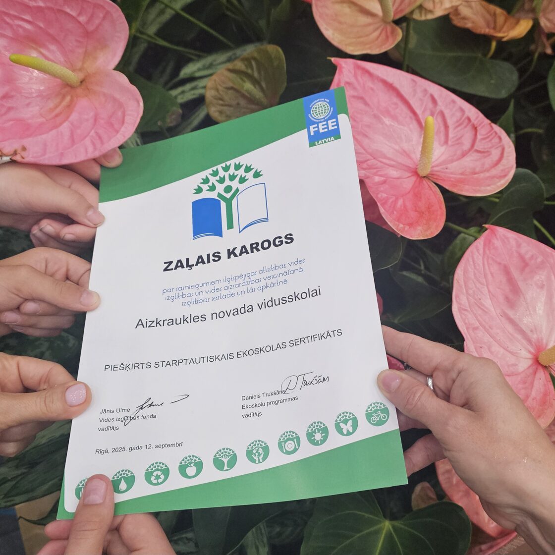 ieguva Zaļo karogu un starptautisko Ekoskolu sertifikātu, tā kļūstot par Ekoskolu.