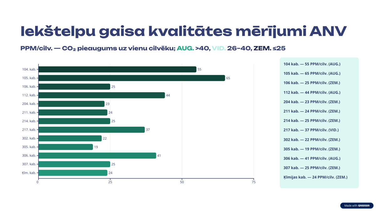Pētījumā aktīvi iesaistījās visa skola — katra klase ievāca datus par gaisa kvalitāti skolā. Ir noskaidrots, kuros kabinetos gaisa kvalitāte ir lieliska, un kur vēl nepieciešams pilnveidot vēdināšanas paradumus, lai ikdienā elpotu tīrāk un justos labāk!